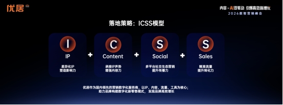 為助力企業落地「心價比」營銷,蔡鉞分享了優居沉淀多年的高效營銷方法論ICSS——I(IP):打造差異化IP,塑造品牌勢能;C(內容):承接IP熱度,強化內容生產;S(社媒):多平臺聯動,擴大傳播聲量;S(轉化):精準流量運營,提升轉化效率。