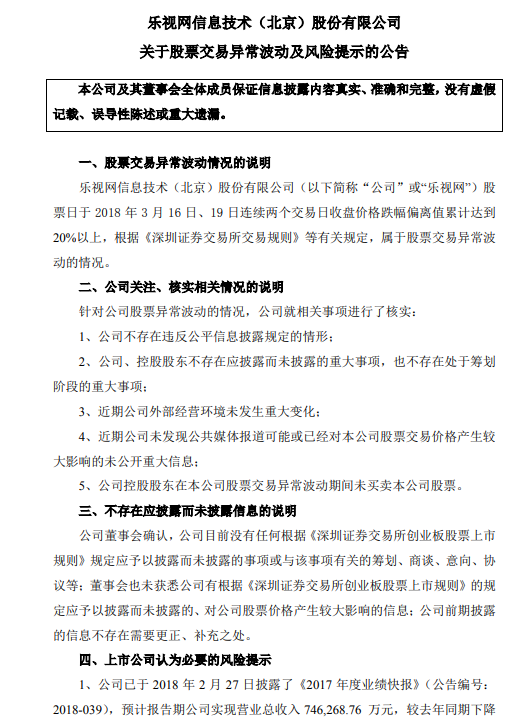 3月19日晚,樂視網(wǎng)披露股價異動公告稱,公司、控股股東不存在應(yīng)披露而未披露的重大事項,也不存在處于籌劃階段的重大事項。同時,公司提請投資者注意實控人可能發(fā)生變更、部分關(guān)聯(lián)方應(yīng)收款項存在回收風(fēng)險、賈躍亭及賈躍芳未履行借款承諾導(dǎo)致公司現(xiàn)金流緊張等八大投資風(fēng)險。
