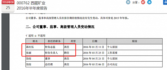 不過在2016年第六屆董事會第四十次會議上,西藏礦業也確實因為蔣紅伍的離職,經饒瓊提名,聘任了張麗擔任公司會計工作主管負責人。從西藏礦業2016年半年報以及2016年年報里看到,張麗的頭銜始終為“財務負責人”,而非“財務總監”,這或許也是上市公司需要對監管層解釋的地方。